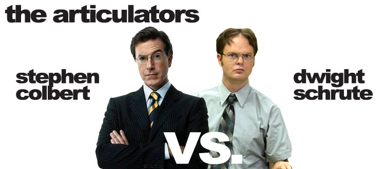 The purpose of this in-class writing assignment is to call attention to a new breed of 'man', performer, and new age hero: The Articulator. An attempt to describe The Articulator will be done so in comparison and context to other pop culture references like The Rapper. The Rapper, known for patterns of specialized speech, both regular, irregular and including but not exclusive to conversation or rhetoric, is a rhythmic linguist some consider lyrical poets. Consequently, The Rapper has become emblematic of an American dream revised, which is a working draft in constant motion and progress. The lifestyle of The Rapper is characterized by excess, carbon-based light dispersion, and territorial game play. Alpha males police the boundaries of their success en masse in ritual-like rites of televised passage dressed down in allotropes of carbon driving pricey, imported rich-smelling vehicles only to be parked in front of large homes featuring imposing steel refrigeration cases packed with precision and symmetry with cold, cold beverages rich with manufactured colors, nutrients, and saccharides. The lifestyle should not be confused with the art and craft no matter how difficult it is to isolate said parts. The two are one in the same. The Articulator is not necessarily a musician nor has he/she quite achieved the matching ensemble and lifestyle of their Rapper counterpart. The Articulator takes its name from the act, much like rap, which some (Wikipedia) say is an acronym for 'Rhythmic America Poetry'. Comedians Stephen Colbert and Rainn Wilson's character Dwight Schrute of The Office fame are the most accurate examples of this dynamic, well-spoken, and striking species. These individuals/characters posses unique curry-like powers, with clean, clear, and exacting pronunciations of words - artful articulation done so with lethal sniper-like precision - are combined with a unique point of view, offbeat savvy, and deadpan, spot-on delivery. They are masters of their craft and the universe. We present The Articulator. This is a completely objective and biased comparison of the following candidates.